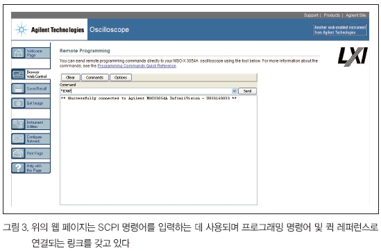 이러한 웹 인터페이스를 통해 엔지니어는 공식 프로그램에 입력하기 전 SCPI 명령어 일부를 시험할 수 있다.