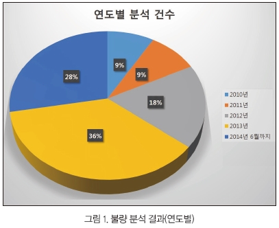 자세히 살펴보면 ‘10년 13건, ‘13년 56건, ‘14년(6월 기준) 43건을 기록하며 꾸준히 의뢰 횟수가 증가하고 있다. 이러한 추세로 의뢰가 들어온다면 ‘14년 총 의뢰 건수는 약 80건을 기록할 것으로 보인다.