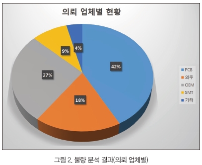 그림 2에 업체별 불량 분석 현황에 대해 나타냈다. 이 그림을 보면 PCB 업체의 의뢰가 42%로 가장 높았고 엔드 유저(OEM) 27%, 외주 업체 17%, SMT 업체 9% 순으로 불량 분석 의뢰가 들어왔다.