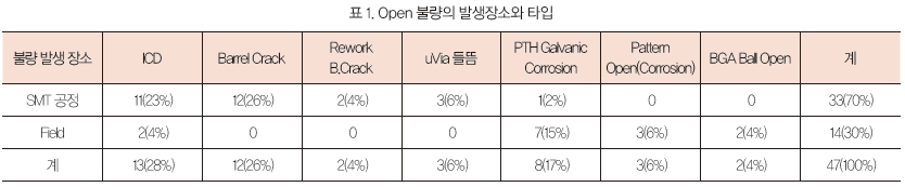 또한 Open 불량 중 필드에서는 PSR Tenting 사양으로 Hole 속에 Acid Trap 되어 PTH 속 동도금이 부식돼 Open된 불량(PTH Galvanic)이 52%로 가장 많았으며, SMT 공정 중에서는 Ba- rrel Crack 이 36%, ICD가 32%를 차지하며 가장 많은 비중을 차지했다.
