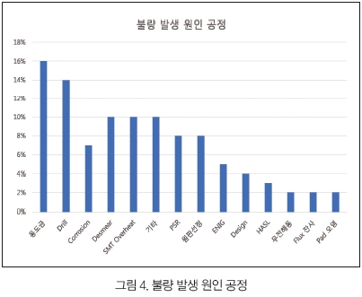 그다음으로 많이 불량을 발생시킨 공정은 Desmear인데, 이로 인해 HWS가 발생하고 그 결과 ICD(Hole Open) 불량이 발생하기도 한다. 이 외에 Large Hole의 Through Hole Component Soldering시 Over-heating으로 인해 발생한 불량(SMT Overheat)과 원판 선정이 잘못되어 발생한 불량 등도 많은 비중을 차지했다(그림 4).