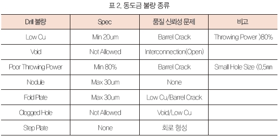 표 2에 동도금 불량의 종류에 관해 나타냈다.