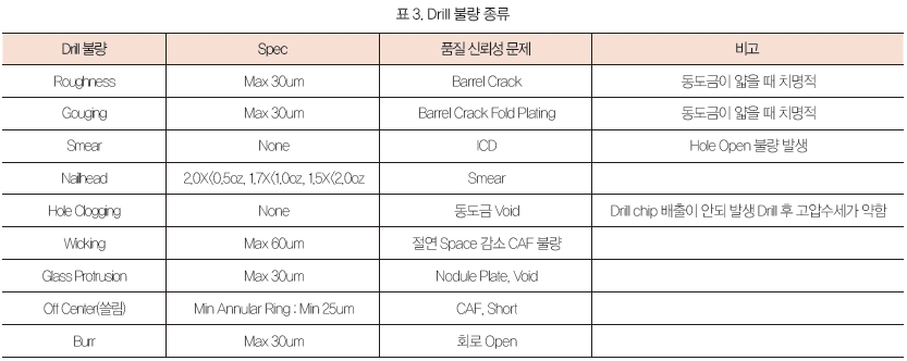 이 공정에서는 원가절감을 목적으로 Stack High 증가, Bit의 사용, Hits 수 증가와 Drill 후 품질검사, 도금 전 수입검사를 생략하기 때문에 발생한다. Drill 불량의 종류는 다음과 같다(표 3).