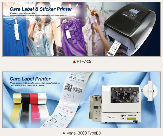 한편, Vega-3000 TypeED는 의류나 속옷, 신발, 가방 등 다양한 제품의 케어라벨에 양면3도(전면2도+후면1도)의 색으로 동시에 인쇄가 가능하며, RoHS 인증을 받은 바코드 프린터기이다.