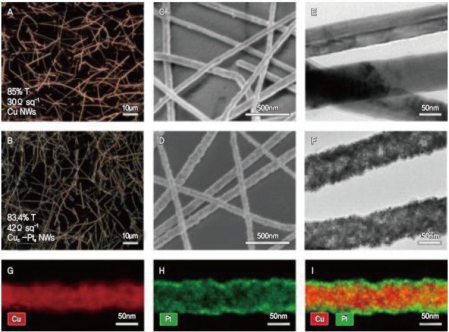 그림 1. 개발된 구리-백금 코어-쉘 나노선의 암시야 현미경(A, B) 및 전자현미경 분석