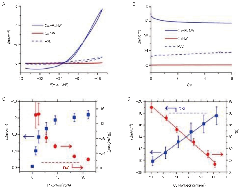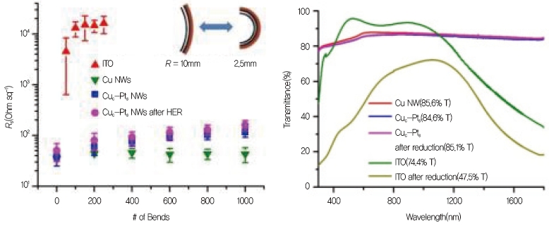 또한 구리-백금 나노선 전극은 광전기촉매 장치나 염료감응 태양전지 등에 사용되고 있는 고가의 인듐주석산화물(ITO) 투명전극을 대체할 수 있다.