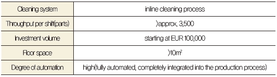 또한 장비는 부품의 기대 산출량을 만족시켜야 하기 때문에 인라인 세척장비는 많은 종류의 부품 및 생산량이 요구되는 전자부품을 제조할 때 더욱 효율적이다. 표 1은 가능한 예에 대해 나타냈다.