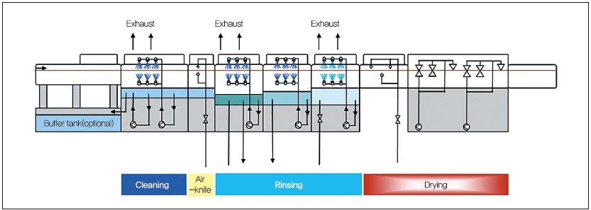 따라서 비용 절감과 효율적인 인라인 세척 프로세스를 유지하기 위해서는 낮은 온도에서도 세정할 수 있는 세척액을 사용하는 것이 권장된다. 또한 상온에서 이루어지는 린스 및 건조 온도와 시간 또한 세척 기판에 알맞게 세팅되어야 한다.