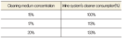 예를 들면, 최근 주로 사용하는 수용성 세척액은 낮은 농도로도 우수한 세척 결과를 내고 있다. 이처럼 인라인 세척 시스템에서 세정액의 농도를 줄인다면, 상당부분 비용 절감을 실현할 수 있다.