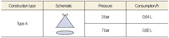 스프레이 압력과 노즐을 적절히 조합한다면 세척액 분사를 줄일 수 있기 때문에 시스템의 배기로 튀어 나가는 세척액 손실량을 줄일 수 있다. 표 3에 특정 스프레이 노즐의 압력당 액 소비량의 차이를 나타냈다.