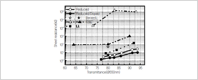 • 산화 그래핀을 환원한 rGO(reduced Graphene Oxide) 그래핀을 이용하면 저렴한 비용으로 투명 전극을 얻을 수 있다.