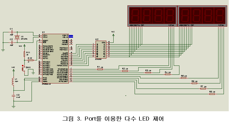 Bus LED 제어 방식의 회로는 간단한 LED 제어 회로보다 약간 더 복잡하다(그림 3 참조). 이 제어방식도 Port를 사용한다.