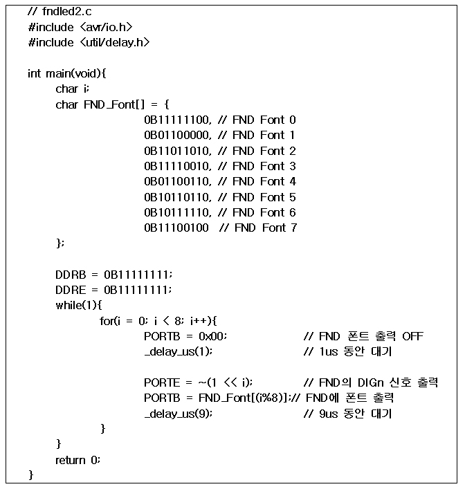 [예제 2] 이 프로그램은 8개의 FND에서 맨 오른쪽 FND부터 좌측으로 움직이면서 0, 1, 2, 3, 4, 5, 6, 7이 차례로 켜지는 것이다. FND 디스플레이의 제어 동작을 확인하기 위해 대기시간을 100ms로 하였다.