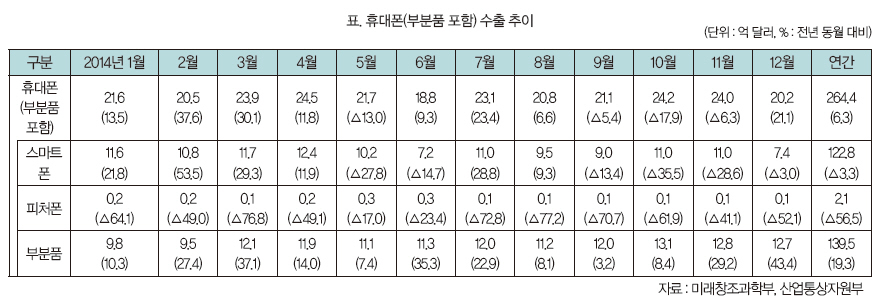 우리나라 휴대폰 시장은 작년 한 해 선진 시장의 성장세가 둔화되고 샤오미 등과 같은 후발 업체의 공세가 거세졌음에도 불구하고 264억 4천만 달러(2013년 대비 6.3% 증가)의 수출을 기록하며 2년 연속 성장세를 나타냈다.