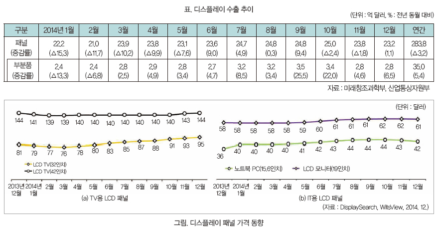 디스플레이 패널 업체들은 지난해 중국과 같은 경쟁국들의 거센 추격 속에서 분투했지만, LCD TV 패널 가격의 보합세와 홍콩을 포함한 대 중국 및 아세안 수출 감소로 인해 수출액이 전년 대비 3.2% 감소한 283억 8천만 달러를 기록했다.