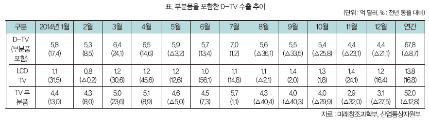 지난해 세계 TV 시장은 3년 연속 역성장 기조에 머물렀다. D-TV 수출은 전년 대비 8.7% 감소한 67억 8천만 달러로 잠정 집계됐다. LCD TV는 수출이 16.8% 상승한 반면, TV 부분품은 12.8% 하락하며 전체 TV 수출 하락의 원인이 됐다.