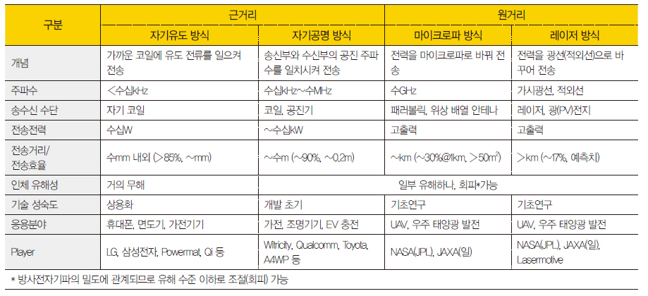현재 개발되고 있는 대부분의 무선전력전송 기술은 자기유도 방식과 자기공명 방식을 이용한 근거리 전송기술이다. 이를 다시 전송 전력으로 구분하면 스마트폰 무선충전기와 같은 10W 내외의 소전력 분야와 전기자동차용 무선전력 충전기를 포함하는 수kW 이상의 전력 공급 분야로 나눌 수 있다.