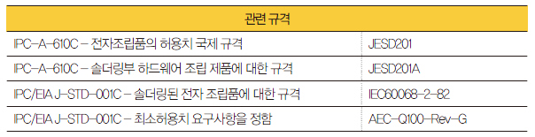 자동차 전장품에서 무연 솔더 신뢰성 규격의 요구 조건을 보면, 솔더 및 전장품에 사용되는 모든 부품과 부품의 도금 재료는 납 함유량이 0.09wt% (900ppm) 이하여야 하며, 관련 규격은 표 1과 같다.