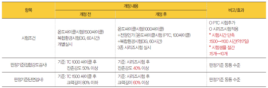 전장품 회로의 전기적 특성 변화에 기인한 기능 불량 검출력을 향상하기 위해 전원 인가 온도 싸이클 시험(Power Temperature Cycle)을 추가했으며, TC·PTC·복합 환경 시리즈 시험을 적용해 필드 작동 환경을 반영하고 시험 시간을 단축한다.