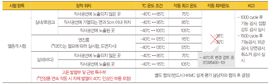 표 3. 장착 위치별 열충격 내구 시험 조건