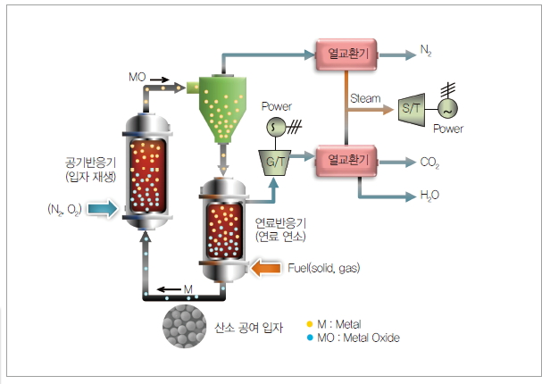 연료에 산소를 전달한 산소공여입자는 회수된 후 공기로부터 산소를 얻어 재생된 다음 재사용되는 케미컬루핑 과정을 반복한다. 연료의 연소가 일어나는 반응기와 산소공여입자가 재생되는 반응기의 온도는 약 800∼1200℃로서 두 반응기에서 배출되는 가스의 압력 및 열을 이용하여 발전을 할 수 있다.