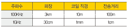 표. 주파수, 코일 직경, 전력전송 거리의 관계