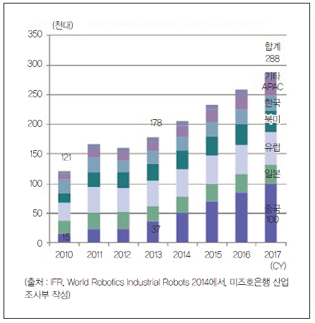 세계로봇연맹(IFR)에 따르면, 전 세계 산업용 로봇 출하 대수는 2012년 15만9,300대에서 2013년 17만8,100대로 확대됐다. 특히 중국의 출하 대수는 2012년 2만2,900대에서 2013년 3만6,500대로 급속히 확대되어 세계 시장의 견인차 역할을 하고 있다. 중국은 2013년 일본을 제치고 1위의 출하 대수를 기록했다.