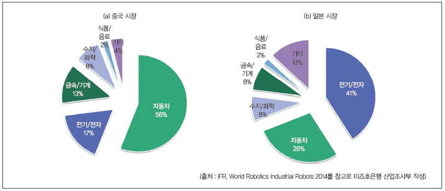 자동차 분야의 비중이 큰 배경에는 최근 몇 년간 급속도로 성장한 중국 자동차 시장의 확대가 있다. 중국 자동차 시장은 2009년에 신차 판매 대수 1,364만 대를 달성해 미국 판매량을 제치고 세계 1위의 시장이 됐다. 2014년에는 2,349만 대로, 판매 대수 확대는 계속되고 있어 계속해서 세계 최대 판매량을 유지했다. 중국 자동차 시장의 빠른 확대와 자동차업계의 산업용 로봇 도입이 로봇 수요 확대를 이끌면서 중국 산업용 로봇 시장의 확대를 견인했다고 볼 수 있다.