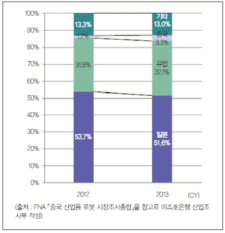 중국 시장에서 산업용 로봇회사의 국적별 점유율을 보면, 2013년 시점에 일본 점유율은 51.6%로 과반수를 차지해 세계에서 일본 로봇회사의 위상이 높다는 것을 그대로 반영했다. 한편, 중국 자본계의 점유율은 3.3%로 2012년 대비 +2.1%로 소폭 증가했지만, 현시점의 위상은 매우 낮다. 현재 중국 산업용 로봇시장에서 일본 점유율에 유럽계 점유율 32.1%를 더한 외국계 점유율은 80%를 넘어 외국계 로봇 제조업체 주도의 시장이라고 할 수 있다.