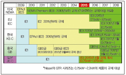 IE3 경우, 미국은 2010년부터(기어모터는 제외), 한국과 일본은 2015년부터 용량별로 규제를 순차적으로 실시하고 있으며, EU와 중국은 2016년부터 시행할 예정이다(표 1 참조).