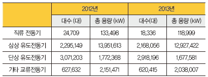 전동기의 생산/출하 대수는 단상유도전동기가 최대이나 총 용량에서는 삼상유도전동기가 가장 많았다. 고효율 규제에 의한 에너지절약 효과 역시 삼상유도전동기가 최대인 것으로 나타났다.