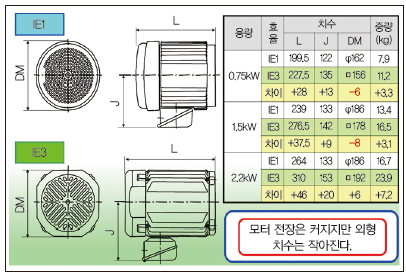 이 제품은 또 모터 사이즈가 현행품과 동일한 치수, 동일한 기종 구성으로 기어모터에서 대체 및 기종 변경이 간편하다(0.1kW~2.2kW의 용량 구성). 특히, 일부 제품(0.75kW 이하)의 경우는 팬리스 구조로 인해 전장 치수를 단축할 수 있다.