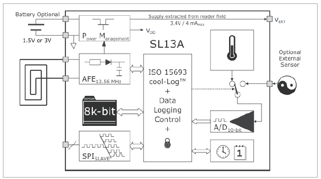 이러한 기능들은 현재 ams의 단일 칩인 NFC 센서 트랜스폰더(SL13A)에서 모두 제공되고 있다(그림 2). 이 칩은 NFC-V(ISO15693) 표준에 부합하며 온보드 온도 센서가 통합돼 있다.