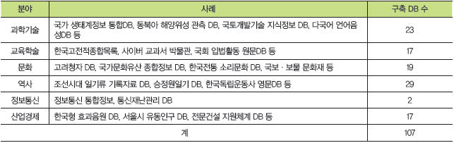현재 국가 DB는 6개 분야에 107개로 구축돼 있으며, 데이터 물량은 약 1억8226만 건에 달한다. 분야별 구축 DB 수는 표 1과 같다.