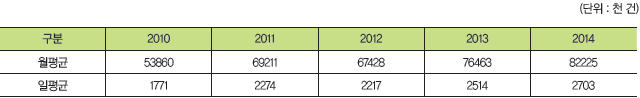 2014년 12월 기준 월 평균 이용 건수는 약 8천200만 건이며, 최근 5년간의 이용 현황은 표 2와 같다.