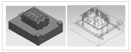 배터리 케이스의 코아와 캐비티를 직접 설계 제작하여 제품의 치수 정밀도와 표면 조도, 가공 시간 등을 현재의 제조 공정과 비교 분석하여 실용성과 적용성을 검토하고자 했다. 그림 1은 DMLS 공정과 NC 가공으로 복합가공한 배터리 케이스의 캐비티 금형 부품을 나타내고 있다.