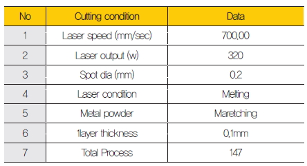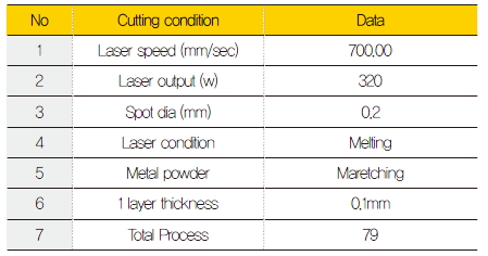 표 1. DMLS 공정으로 제작된 캐비티 부품의 가공 조건