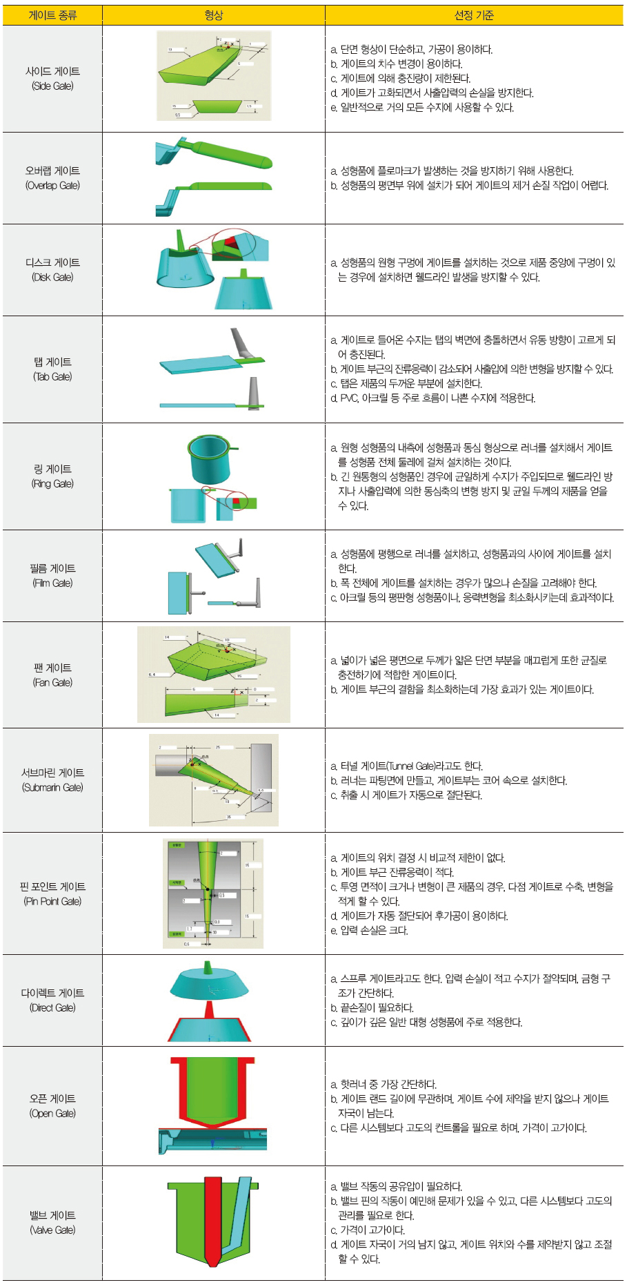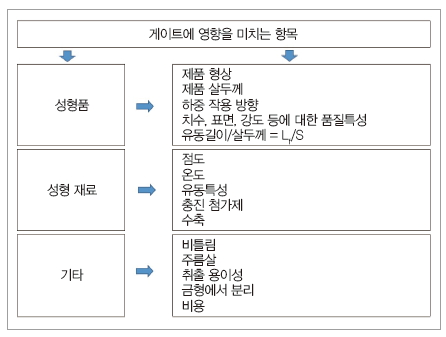 전체적인 금형의 성형 시스템(구조)에 있어서 대체로 가장 얇은 부분이다. 크기와 위치는 여러 가지의 필요 사항들을 고려하여 정해지며, 게이트에 영향을 미치는 항목들은 그림 2와 같다. 이들은 게이트의 위치, 모양 그리고 크기를 정하는 요인으로 금형 설계 시 고려될 사항들이다.