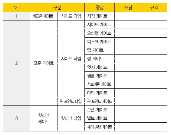 게이트는 일반적으로 표 1과 같이 비표준 게이트와 표준 게이트, 핫러너 게이트 등 3종류로 분류한다. 표준 게이트는 비표준 게이트에 비해 용융수지의 응고가 급속히 일어나도록 크기를 제한하는 것을 말하며 제한 게이트라고도 한다. 반면에 비표준 게이트는 게이트를 급속히 고화되지 않아도 되는 게이트를 말하며 직접 게이트가 여기에 속한다.