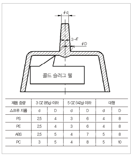 ⑧ 스프루 입구 지름은 노즐 구멍에 좌우되며, 노즐 구멍 지름의 0.5mm~1.0mm 정도 크게 하고 테이퍼 각도는 2~4도 정도로 한다.