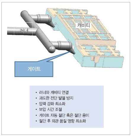 게이트는 러너와 캐비티를 연결하는 중간 매체이다. 그림 1에서와 같이 게이트는 캐비티에 용융수지를 충진하도록 안내하는 기능과 충진 완료 후 캐비티 내의 수지가 역류하는 것을 방지하는 기능을 가지고 있다. 게이트는 게이트의 위치, 게이트의 수, 형상 치수는 성형품의 외관이나 성형 효율 및 치수 정밀도에 큰 영향을 준다.