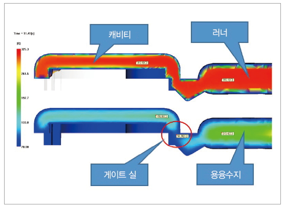 ② 스프루, 러너를 통과한 냉각된 수지는 좁은 게이트를 통과하는 동안 유동 속도가 빨라져 마찰력이 발생되며, 이 열에 의해 수지 온도가 상승되어 플로마크(Flow Mark)나 웰드라인 생성을 예방하기도 한다.