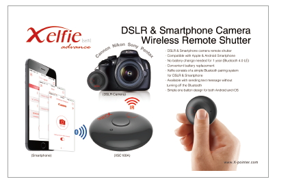 DSLR 카메라 무선 리모콘 ‘셀피 어드밴스(Xelfie Advance)’는 블루투스로 스마트폰과 연동하여 스마트폰을 이용해 DSLR 카메라를 촬영할 수 있는 DSLR 카메라 무선 리모콘이다. Canon, Nikon, Pentax, Sony 4종류의 카메라 모두 호환이 가능하며 촬영 시간을 설정하여 타임랩스 촬영 또한 가능하다.