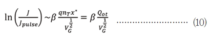 우리는 가장 최근 4개의 펄스가 서로 다른 펄스 높이(2V)를 가지고 있기 때문에, 그림 6에서 첫 10개의 I-V 곡선만을 고려했다. 그림 6에서 보이는 바와 같이, 필자는 ln(J/Jpulse) 곡선들에서 대향 영역을 추정하여 포획 전하를 평가하고 난 후, 식 10을 적용하여 포획된 전하를 평가했다. 그림 7은 그 결과를 보여준다.