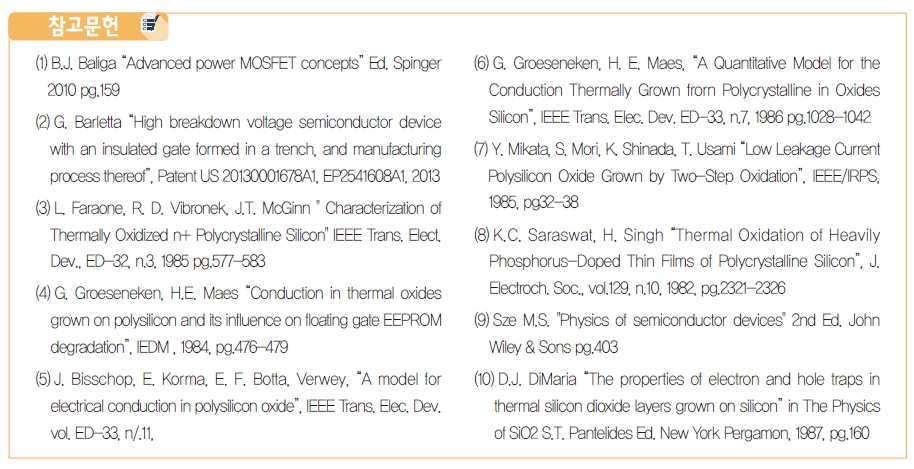 그러나 이를 적용하면 n+-다결정 상에 열산화막 성장이 폴리실리콘-폴리옥사이드 계면에서 두께 균일성(3) 및 국부 전계 증가(local field enhancement)(4)~(6)로 인해 높은 누설전류를 초래한다고 알려져 있다. 더불어 산화막의 전기적 특성은 폴리 증착 온도 도핑 공정(poly deposition temperature doping process) 등의 제조 공정과 열산화법에 크게 의존하는 것으로 나타났다(7), (8).