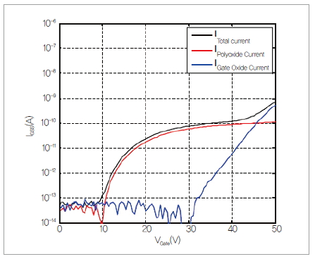그림 2는 IGSS 수치가 높은 문제가 있는 CC-MOSFET의 I-V 특성을 보여준다. 더 나아가 지배적인 누설 경로를 분리하기 위해, I-V 특성은 DUT 상에서 수행했다.