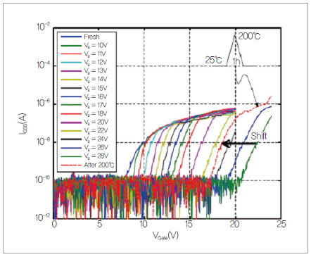 그림 5. 그림 4에 우리는 1h 동안 삼각 램프(triangular ramp)에 의해 200℃에서 열처리한 후의 IV 곡선을 추가열처리 후, 우리는 낮은 게이트 전압에 I-V 특성의 회복을 관찰했다