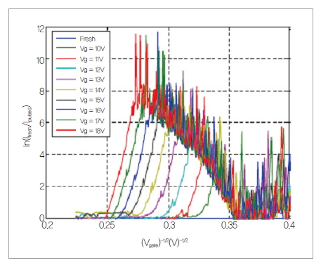 여기서 모든 펄스는 IGSS를 감소시키며, 폴리옥사이드에 포획된 전하로 인해 더 높은 Vg에서 터널링 누설의 온셋(onset)을 촉진하는 것으로 보인다. 폴리옥사이드 누설은 폴리옥사이드 유전체에 포획된 전하가 다음 펄스 중에 주입된 전자들의 정전 차폐(electrostatic shield) 효과로 인해 모든 직사각형 펄스 이후에 감소한다. 폴리옥사이드 내에 주입된 전자들이 경험하는 유효 전계(Eeff)는 다음과 같이 설명된다.