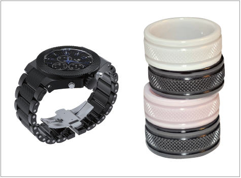 부일신소재의 주요 제품에는 지르코니아 세라믹 시계, 지르코니아 세라믹 시계부품, 다양한 색상의 패턴 링이 있다.