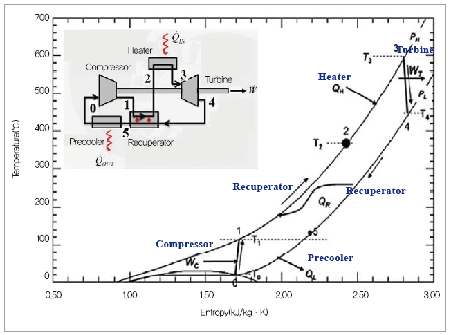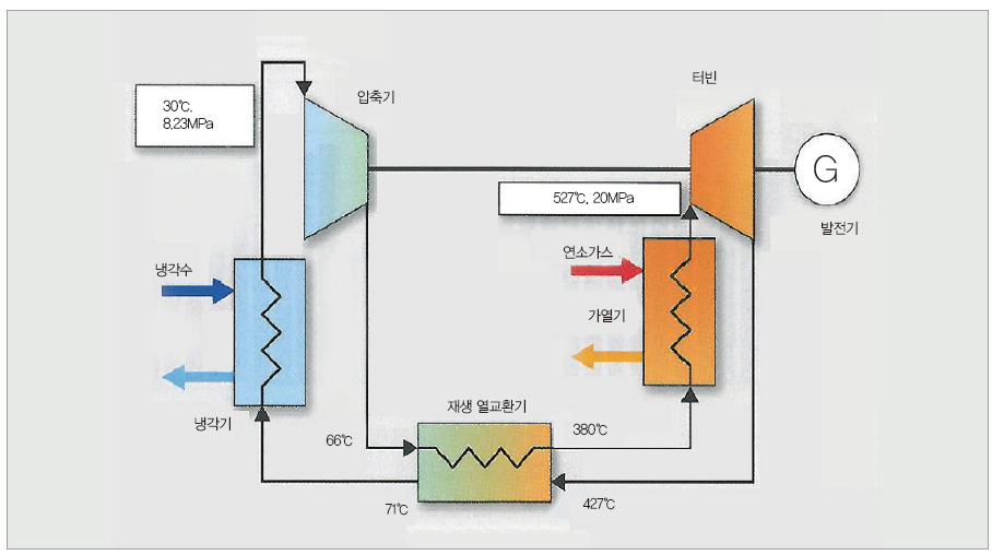 초임계 CO₂ 발전 시스템은 압축기, 터빈, 발전기, 재생 열교환기, 가열기, 냉각기로 구성되며 CO₂는 외부로 방출되지 않고 사이클 내부를 순환한다. 그림 2의 T-S선도에서 볼 수 있듯이 브레이튼 사이클과 유사하다. 압축된 초임계 CO₂가 Recuperator에서 터빈 배가스와 열교환을 하고, Heater를 통해 가열돼 터빈으로 들어가서 전력을 생산하게 된다.